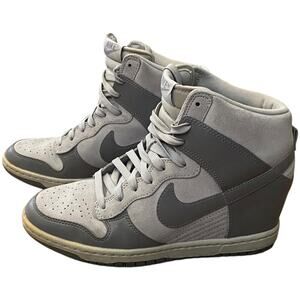 Nike Dunk Sky High Hi Hidden Wedge Suede Sneaker Women's US 8 Gray 528899-005. This is in good condition with no rips or tears. There are signs of wear, including scuffs, creases, and yellow staining. The soles are in good condition with no heel damage.