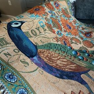 Enhance your living space with this elegant woven throw blanket featuring a stunning peacock design. The vibrant colors add a touch of sophistication to any room.