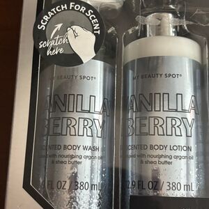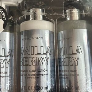 My Beauty Spot Vanilla Berry bath and body gift set. This is a 6-piece set — the bar soap is NOT included. All other items are present and appear unused. Packaging shows light cosmetic wear from storage.