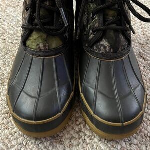 EUC, Stylish duck boots with a camouflage pattern and black detailing. Perfect for outdoor adventures.