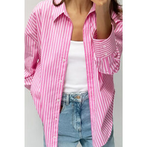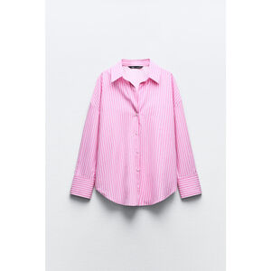 This is a women's oversized button-down shirt from Zara, featuring a vibrant pink base with thin white vertical stripes. It has a classic pointed collar, long sleeves with buttoned cuffs, and a full front button closure. The relaxed fit and curved hem contribute to its casual style. The fabric appears to be a lightweight, possibly cotton or linen blend, suitable for a comfortable, breathable feel.