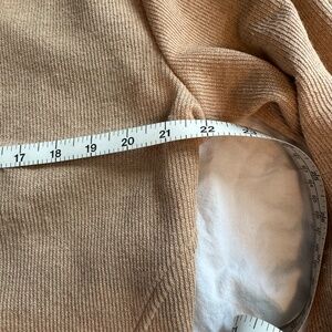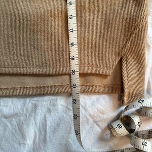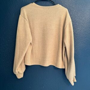 Hyfve Tan Sweater with Notched Front and Lantern sleeve that is flawless. Cute little daily sweater to pair with jeans or even workwear. Size L, no stains, no tears. Measurements are shown.