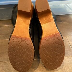UGG Black Leather Clog Boots with Fold-down Shearling Cuffs and Wood Heal.