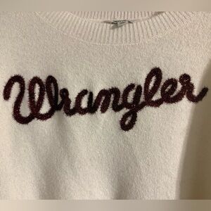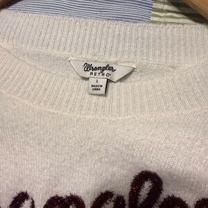 Cozy cream sweater featuring a bold maroon Wrangler logo tinted like tinsel or garland. VERY soft. Very relaxed fit. Size large but fits more like XL or XXL, relaxed fit. Never been worn!