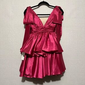 This eye-catching dress features a dramatic oversized bow that adds a playful yet chic touch. The deep V neckline exudes confidence and elegance, while the ruffle detailing enhances the mini dress with a flirty flair.
