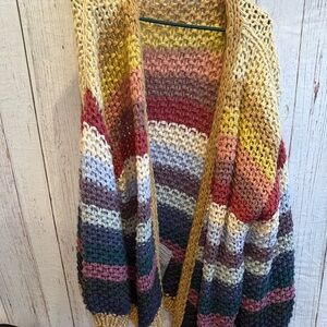 Vibrant knit cardigan with a cozy feel. Features a mix of bold colors. Ideal for layering. Has pockets! Super cozy
