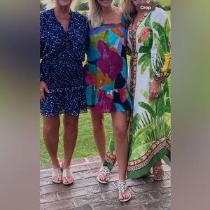 Vibrant dress with a patchwork design. Features a mix of colors including blue, red, and orange.