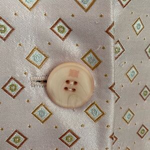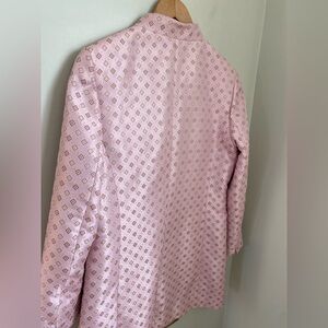 This is a structured, mid-length jacket in a light pink fabric featuring a geometric diamond pattern throughout. The design includes a stand collar, three-button front closure, and two front flap pockets. The interior is fully lined in pink with a multi-colored striped detail at the inner neckline.