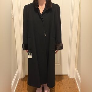 Chic black coat with elegant fur details. Ideal for a refined style. Freshly dry cleaned! Roughly size 10-12! I’m a size 8 usually but loved the oversized look. Also I’m 5’6” and it comes to just above my ankles for length reference. So cute just not wearing much.