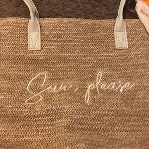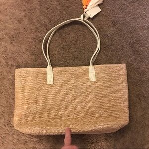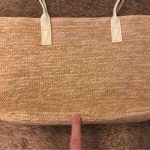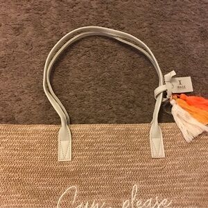 Image Skincare-Perfect for picnics in the park or quick trips to your favorite escape, this braided straw tote is detailed with cream leather straps and orange and yellow fringe pom poms. Limited release. Yellow lining. Condition: Good, gently used • Lined • Straw/faux leather