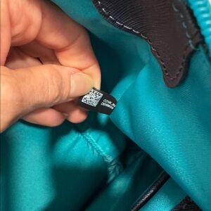 This is a beautiful Michael kors teal aquamarine color nylon tote bag. It has a front zipper pocket and a back pocket as well as several inside. It is in perfect shape with no flaws. It measures 19” x 12.5” x 5”.