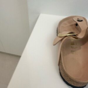 Elegant Birkenstock sandals in beigey pink (I think they called it new nude). Features a stylish gold buckle. Perfect for casual wear. Only worn once. Basically brand new!!!!!