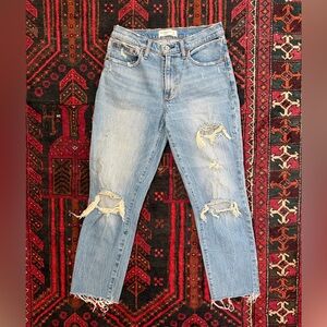 Size 27 waist (size 4). Ankle length straight leg boyfriend jeans with some stretch. Super comfortable, perfectly distressed. Worn a handful of times.