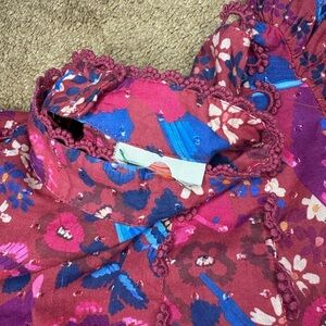 Vibrant Farm Rio floral blouse with red and blue hues. Features intricate lace details.