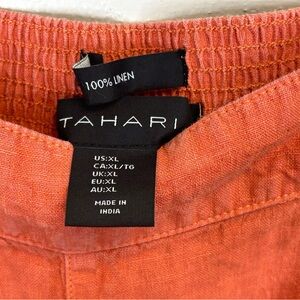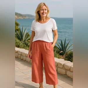 Tahari XL pair of orange linen wide-leg cropped pants. Stylish terracotta wide leg pants by Tahari. Perfect for casual wear. Comfortable and elegant design. Elastic back waist. 2 pockets.