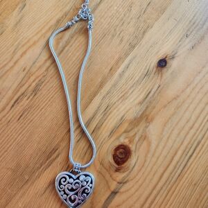 This elegant silver heart pendant necklace features intricate swirl designs, perfect for adding a touch of sophistication to any outfit. excellent condition no damage done. worn a few times
