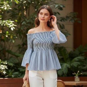 #OffShoulderTop #SmockedTop #SmockedChest #SmockedWaist #FlatteringFit #FigureFlattering #WhiteAndBlueTop #StripedTop #SummerTop #ChicTop #WomensFashion #CasualChic #BeachStyle #ResortStyle #MediumTop