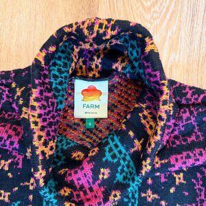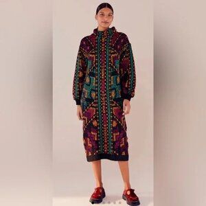 Bold and cozy Farm Rio sweater dress featuring a richly detailed geometric knit in jewel tones. Designed with a relaxed silhouette, long sleeves, and a midi length for effortless statement dressing.