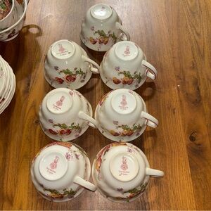 Condition: free of chips and cracks, but one of the teacups as well as the serving dish have damaged finish inside. The others all have some degree of crazing on the exteriors, but no paint loss or wear.