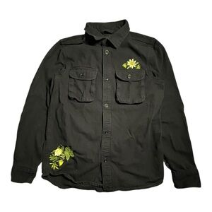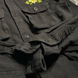 This black button-front utility style jacket features chest flap pockets and beautiful yellow floral embroidery on the chest and hem for a unique streetwear look. Lightweight and perfect for layering year-round.