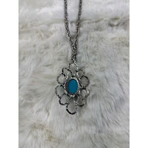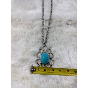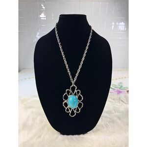 Keywords: statement necklace, turquoise jewelry, silver tone necklace, oval pendant, floral pendant, boho chic, vintage inspired, fashion jewelry, women's accessories, gift for her, everyday elegance, bold necklace