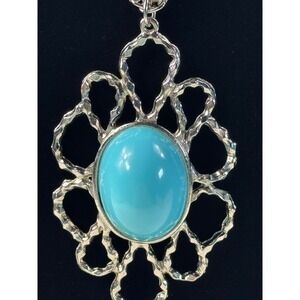 Adorn yourself with this captivating silver-tone necklace, boasting a striking turquoise oval pendant embraced by an intricate, openwork floral-inspired setting. The substantial chain adds a touch of elegance, creating a statement piece that draws the eye. Imagine this necklace adding a pop of vibrant color and sophisticated flair to your everyday outfits or special occasions. Perfect for brunch with friends, a romantic dinner, or adding a touch of personality to your work attire.