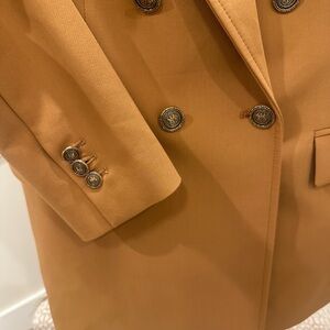 Tailored Zara blazer in a classic camel tan shade with a structured double-breasted front. Features a sharp notched lapel, decorative metal-style buttons, functional pockets, and full lining for polished layering. A versatile wardrobe staple for office, casual chic, or layering.