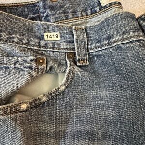 These Levi’s 559 Relaxed Straight Blue Jeans are in good used condition. They are size 38X30.. They have a hole on the front around the knee. See pictures for condition.