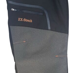 Outdoorsy fleece lined hiking pants, perfect for wet and cold winter activities. Stretchy water resistant zip fly pants with zippered pockets and ankles and elastic waist. Black and grey.
