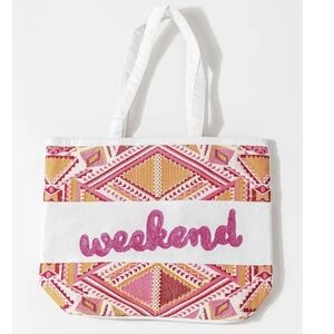 This fabulous “weekend” pink, orange, maroon and ivory canvas tote bag with boho design and fuzzy pink ‘weekend’ is such a fun tote for the beach, vacays, summer trips… you name it!! This stunner has a pink, orange, maroon hued, and ivory boho design with triangles and heart details on the front at the top and bottom with ivory canvas background showcasing the super fun fuzzy pink cursive ‘weekend’ in center. The back of this fab tote is made up of ivory canvas and it has 2 ivory canvas straps. A fabulous tote to use as a beach bag, handbag/pocket book, or weekender. The perfect gift for Mother’s Day, birthdays, just because, upcoming vacations….