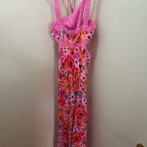 Chic pink dress with vibrant floral patterns. Perfect for any occasion.