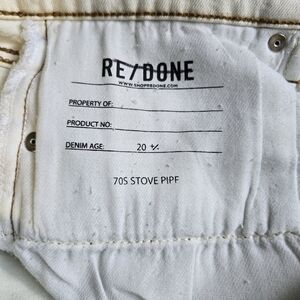 These RE/Done 70s Stove Pipe jeans in size 31 are perfect for anyone looking for a vintage-inspired look. They feature a high rise and straight leg fit with a cropped inseam. The bleach-like color gives them a unique, sunfaded vintage look. Made from comfort stretch denim, they have a classic button fly and a cut-off hem. These jeans are trendy, high-end, and perfect for any retro fashion lover.