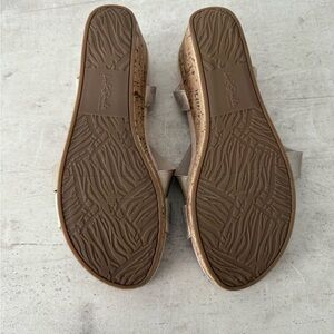 Awesome and extremely comfortable sandals! Fabric upper with an open toe, slip-on fit, elastic goring straps for extra flexibility, and cork-wrapped platform wedge heel. Soft System comfort package provides all-day support, flex, and cushioning. Traction sole provides you with extra stability.
