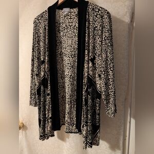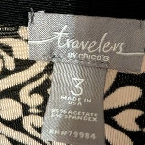 Beautiful and Classic Top from Traveler's by Chicos. Chicos size 3. Good pre-owned condition. Black and Gray, lightweight acetate/ Spandex blend..No closure, open tunic. Flows beautifully, dresses up anything you wear it with. Great for travel. Pit to pit measurement is 24 inches and length is 31 inches. CC4