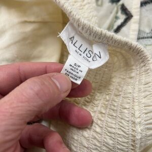 Features a cream / ivory cotton fabric with embroidered geometric detailing, tiered skirt, and a flattering halter neckline. Lightweight and breathable with a soft, vintage-inspired silhouette.