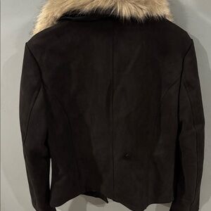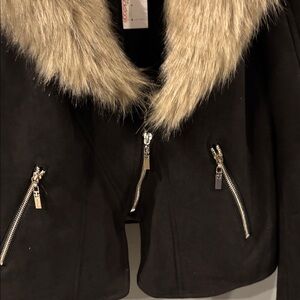Chic black leather jacket by Love Token. Accented with a luxurious faux fur collar. Features stylish zippered pockets.