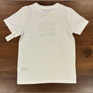White t-shirt featuring a colorful car design. Perfect for casual wear.