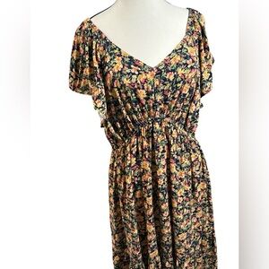 Chic midi dress with a floral pattern. Features a flattering fit. Ideal for casual outings. Elastic band at the bust and full elastic smocking on the back of the bodice making it a very comfortable fit.