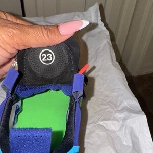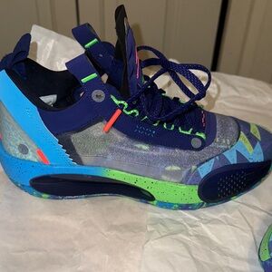 Dynamic Jordan sneakers with a bold blue and green design. Ideal for active kids.
