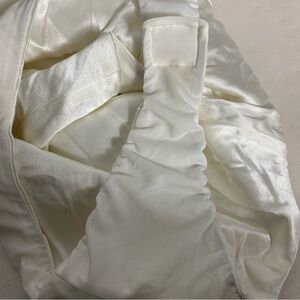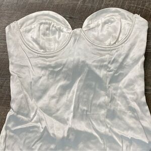 The Zara satin bustier bodysuit in off-white color, size S, is a stylish and elegant piece of women's clothing. Made of luxurious satin fabric, this bodysuit features a one-piece design with a flattering bustier style. The ivory color adds a touch of sophistication, making it a versatile piece that can be dressed up or down for various occasions. Perfect for those looking for a colorful yet chic addition to their wardrobe.