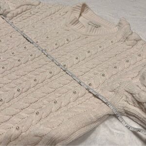 Cozy cream cable knit sweater with an elevated twist. This sweater features an allover chunky cable pattern accented with delicate pearl stud embellishments for subtle shine.