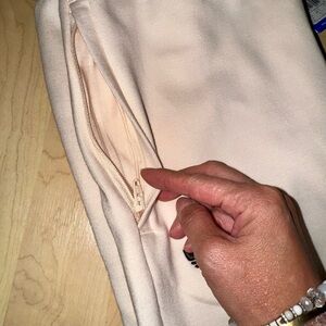 Comfortable cream colored sweatpants featuring classic black accents on left leg. Adidas logo embroidery stamp on top right thigh. Tapered leg and Ideal for everyday style.