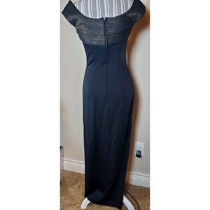 Tadashi Evening Formal Long Dress Black Side Slit Gold Shimmer Neck Detail Sz 6 . Condition is Pre-owned - Excellent. Shipped with USPS Ground Advantage.