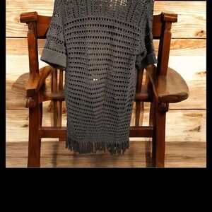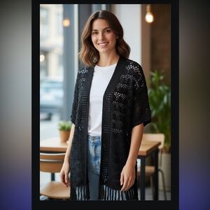 Stylish black crochet cardigan with open front and fringe details. Perfect for layering. Like and get an instant offer