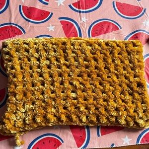 Velvet, homemade mustard yellow crocheted infinity scarf. One loop. Fits cozy around your neck and is very soft. Never been worn.