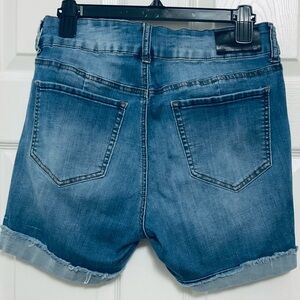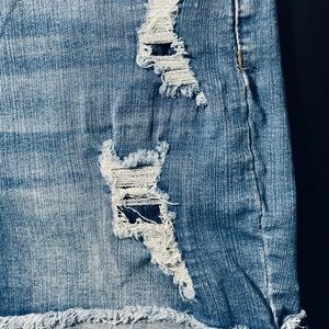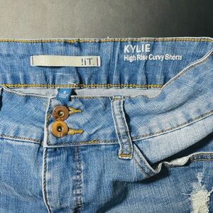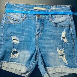 Stylish blue distressed denim shorts perfect for casual outings. Features a trendy ripped design for a modern look. Measuring tape is shown in centimeters.