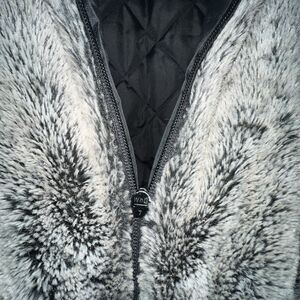 This Quilted Black Vest with Faux Fur Lining is a stylish and versatile piece for women. Made of polyester, this vest features a quilted design that adds a touch of sophistication. The medium size and regular fit make it a comfortable option for everyday wear. The faux fur lining adds a luxurious touch, while the black color and zip closure make it a classic wardrobe staple. The reversible feature allows for multiple styling options, making this vest a practical and fashionable choice for any woman's closet. (Zipper will be backwards and pockets are only on quilted side.)