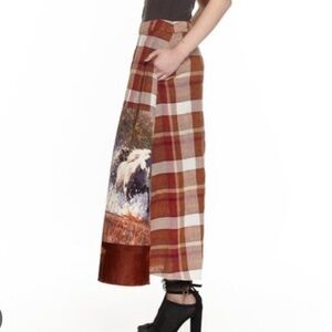 NWT. Embrace a unique style with this brown plaid skirt featuring a stunning horse print and velvet hem. Perfect for casual outings or a day at the ranch. Waist 14