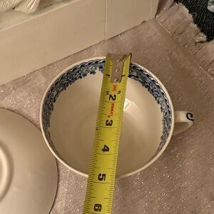 Elegant blue and white teacup with matching saucer. Large 5 in. Cup in size Features Wallam Abbeys Woods Burslem England