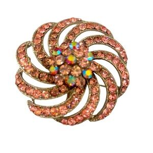 Vintage pale pink & Aurora borealis crystal brooch in swirl floral starburst design. Not marked but stunning. Silver tone back. Euc